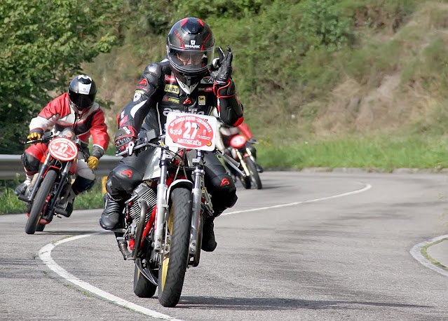 Malgré la nature exigeante des routes à travers les Picos de Europa, nous avons eu deux participants britanniques qui, chaque année, terminent les routes sur des motos de moins de 125cc. Cette année avec une belle MV Agusta et une Moto Guzzy. C'est un véritable spectacle de les voir s'amuser autant que les autres sur ces petites machines qui suscitent toujours un intérêt particulier ainsi que l'admiration de leurs pilotes. Nous avons eu plusieurs exemples de familles qui ont roulé ensemble comme des paires de frères et sœurs, père et fils, père et fille, nièces et neveux etc etc. etc. Il est très excitant de voir les parents parler fièrement de leurs enfants lorsqu'ils sont distraits. Le premier à arriver aux 300 Miles, le plus jeune des Moreno, conduisait la Norton que son père, qui était présent, avait restaurée et possédait depuis de nombreuses années. Les voir tous deux excités sous l'arche d'arrivée était touchant.